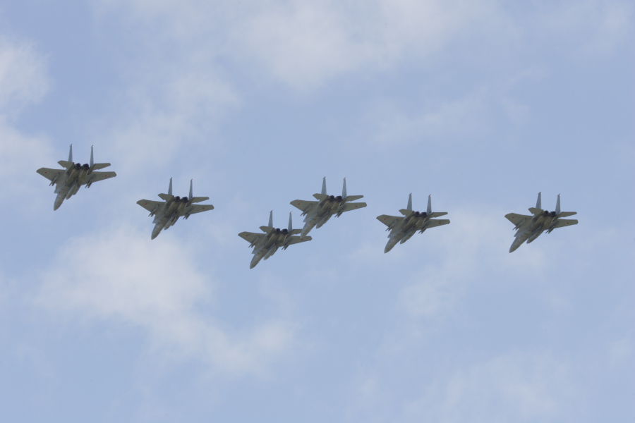 オープニングフライトで編隊飛行を実施する6機のF−15。 |