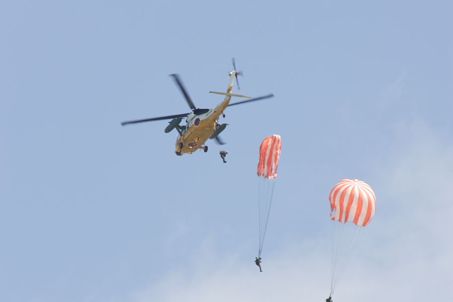 救難訓練展示で、UH-60Jからパラシュート降下する3名の救難員。パラシュート降下は珍しい。 |