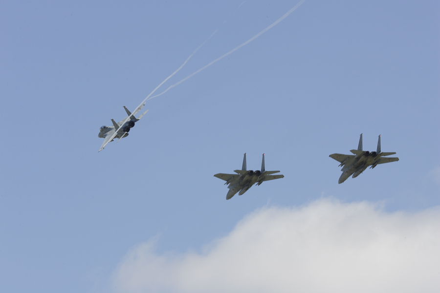 オープニングフライトを終え、コンバットピッチで着陸体勢に入るF-15。 |