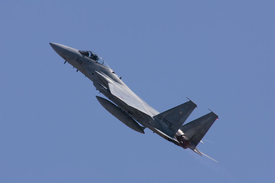 機動飛行展示で、離陸直後に急上昇するF-15。 |