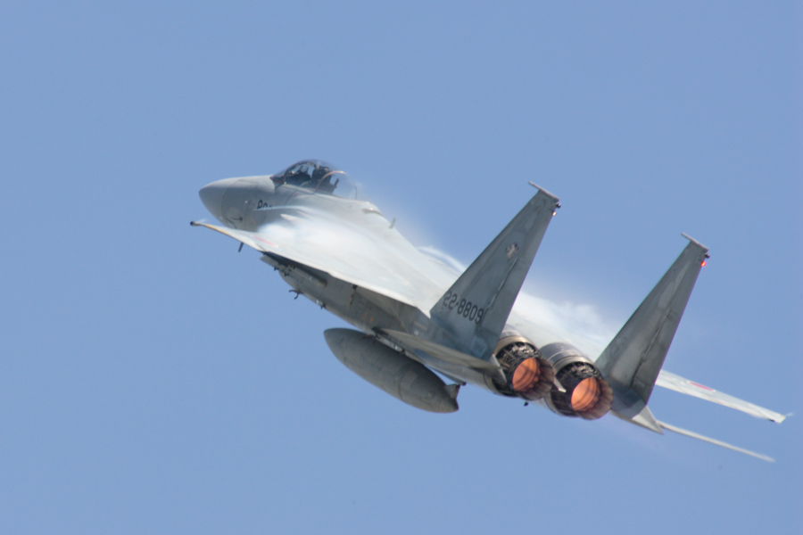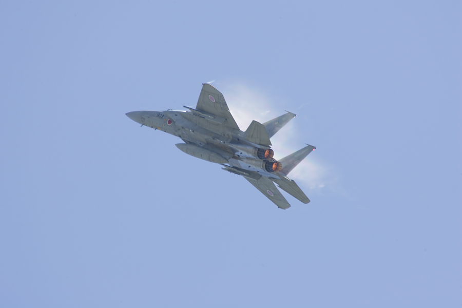 360度旋回後に、急上昇するF-15。機体上部でベイパが発生しています。 |