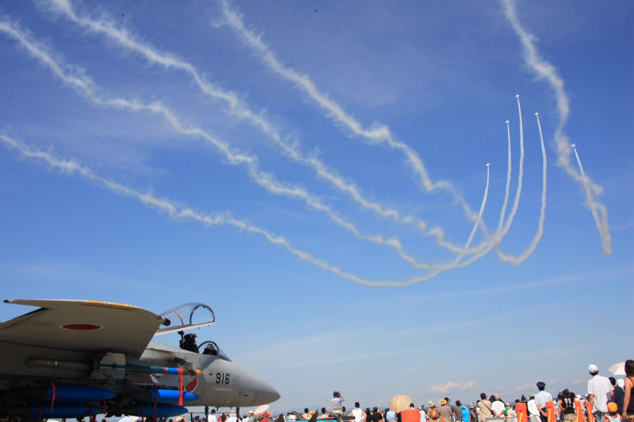 課目チェンジオーバーターンで、一列縦隊からデルタに隊形を組み替えたブルーインパルス。 |