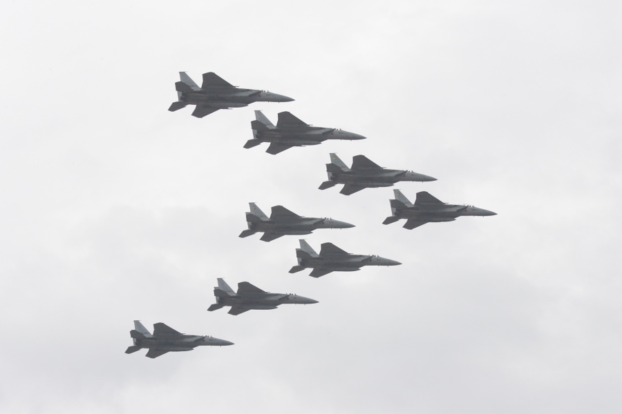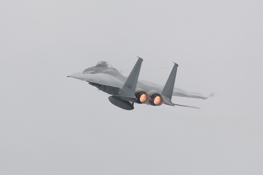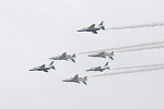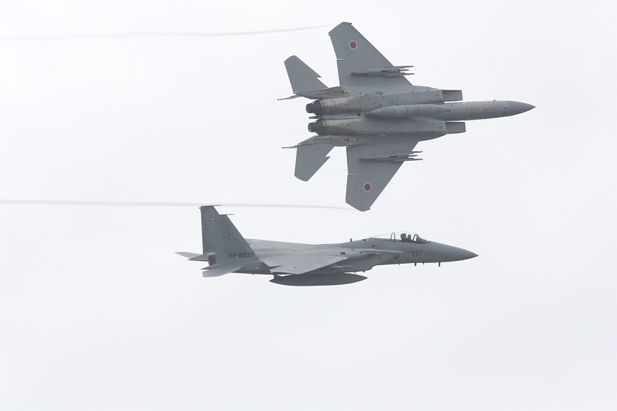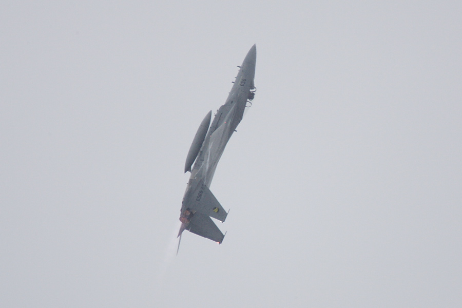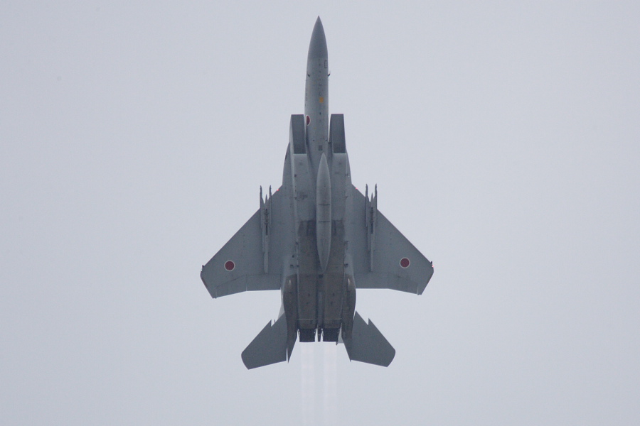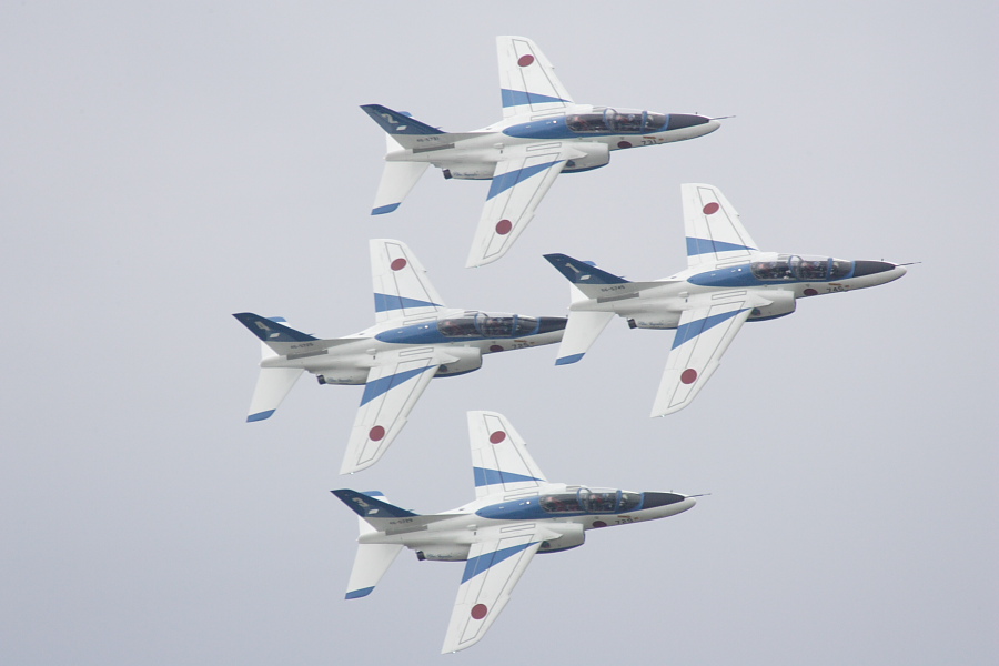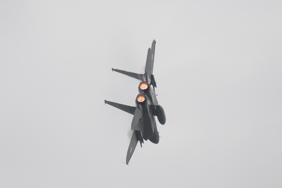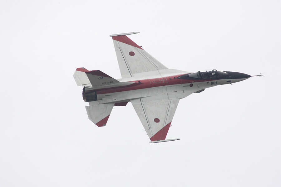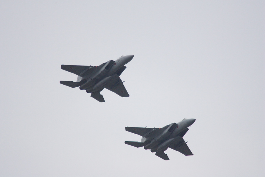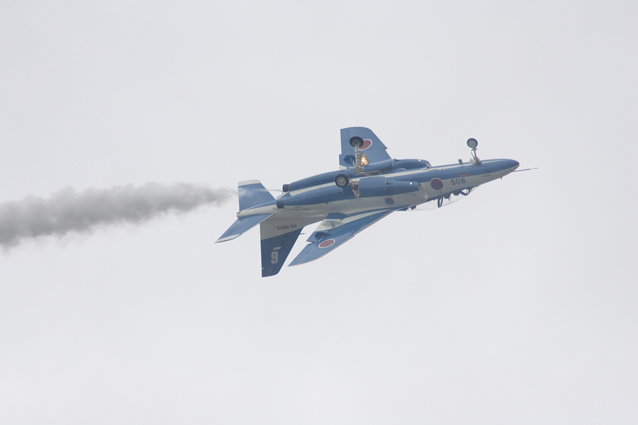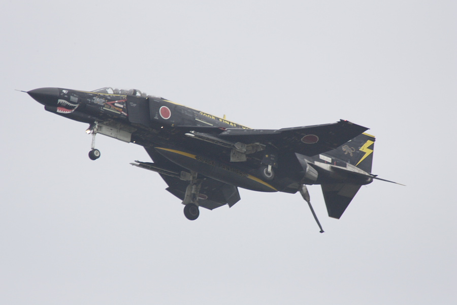 台風13号が直撃しそうなので、小松はパスするつもりでしたが、台風は加速して遥か東へ去っていき、航空祭前日の20日は晴ました。よし、小松へ行こう!と前日に決心しました。でも、21日の朝は雨。最初にしたことは傘を買うこと。とりあえず小松基地に行くか。基地へ向かうバス内からF-15 2機編隊飛行を目撃。おぉ飛んでるぞ。さらに、UH-60Jから救難員3名がパラシュート降下を実施している。プログラムどおりオープニングフライトを実施している。その後、小雨が降る中を303飛行隊が機動飛行を実施。雲が高いので、雨でも問題なさそう。F-2が飛ぶ頃には雨も止みました。今年は三沢から来たF-4が展示飛行を実施しました。三沢の第8飛行隊のF-4は平成20年度ですべて退役するので、記念塗装機での展示です。小松に来たかいがありました。救難展示、F-15 8機による編隊飛行、306飛行隊の機動飛行と順調にフライトが行われ、午前の部は無事終了。午後はブルーインパルスの展示です。曇りなので、垂直系機動のない第3区分が行われます。第3区分はほとんど見たことがないので、どんな展示になるか、ある意味楽しみです。しかし、展示飛行中に会場周辺に黒雲が押し寄せてきます。そのためか、編隊とソロ演技機のタイミングがずれてきます。オポジット・トライアングルを実施したところで、天候不良で展示飛行が中止されます。この頃には雨も降り出しました。残念、最後まで見たかったのですが、仕方ありません。ブルーインパルスが飛ばなかったことはありますが、展示飛行途中で中止は、初めての体験でした。