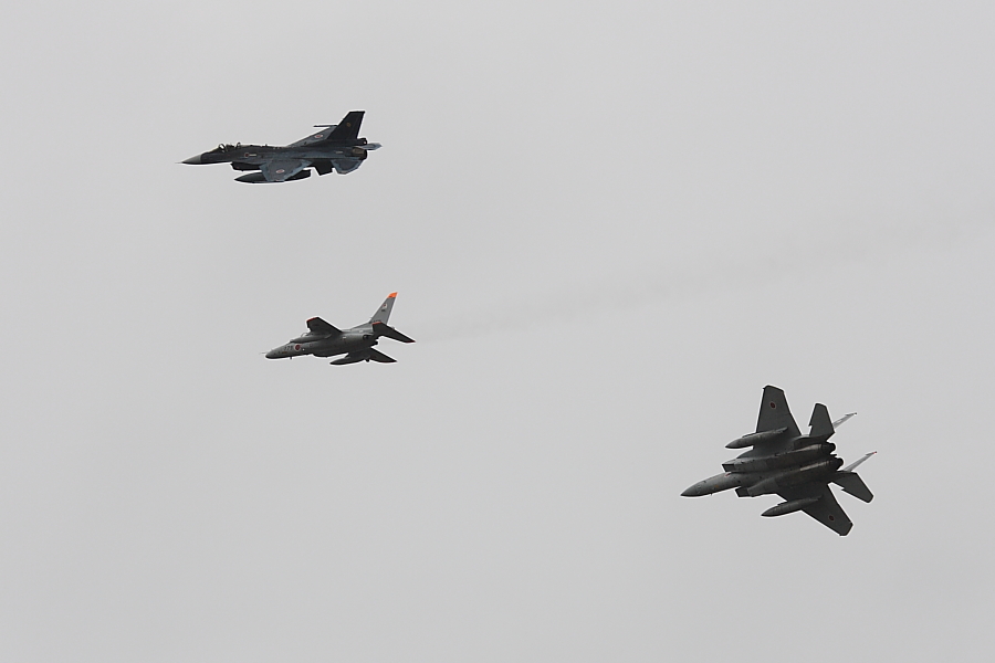 | オープニングフライトで、航過して、編隊を解散する左からF-2、T-4、F-15 |