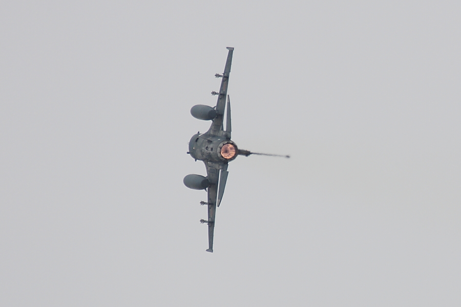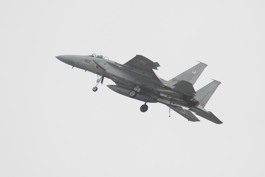 | 脚とアレスティングフックを出して、航過から上昇に移るF-15。 |