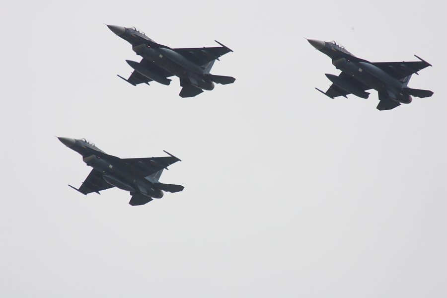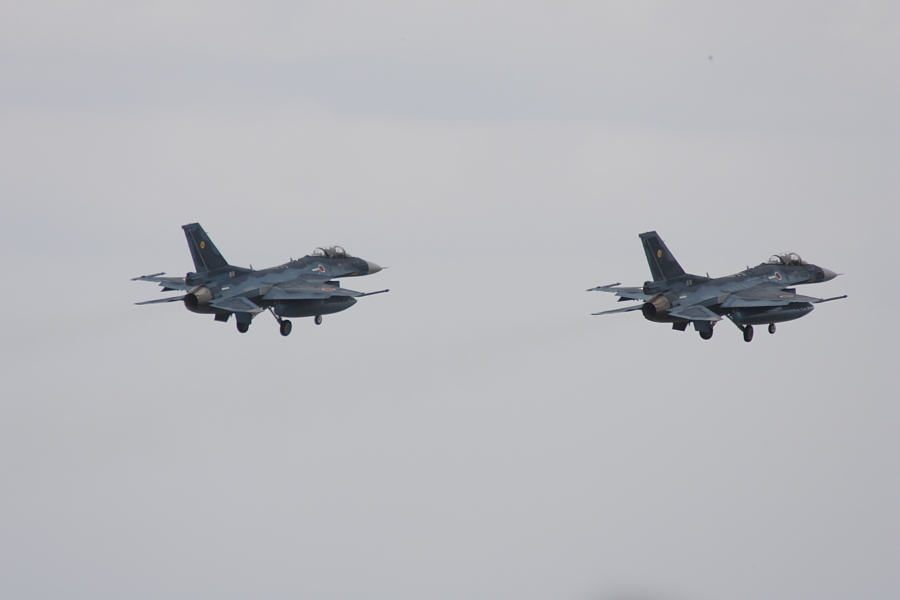 離陸したF-2は4機でしたが、1機は、早々に着陸し、3機編隊になりました。何かトラブルでしょうか。 |