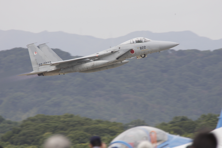 同じく、編隊飛行航過に向けて編隊離陸するF-15。F-15は1機づつ離陸しました。 |
