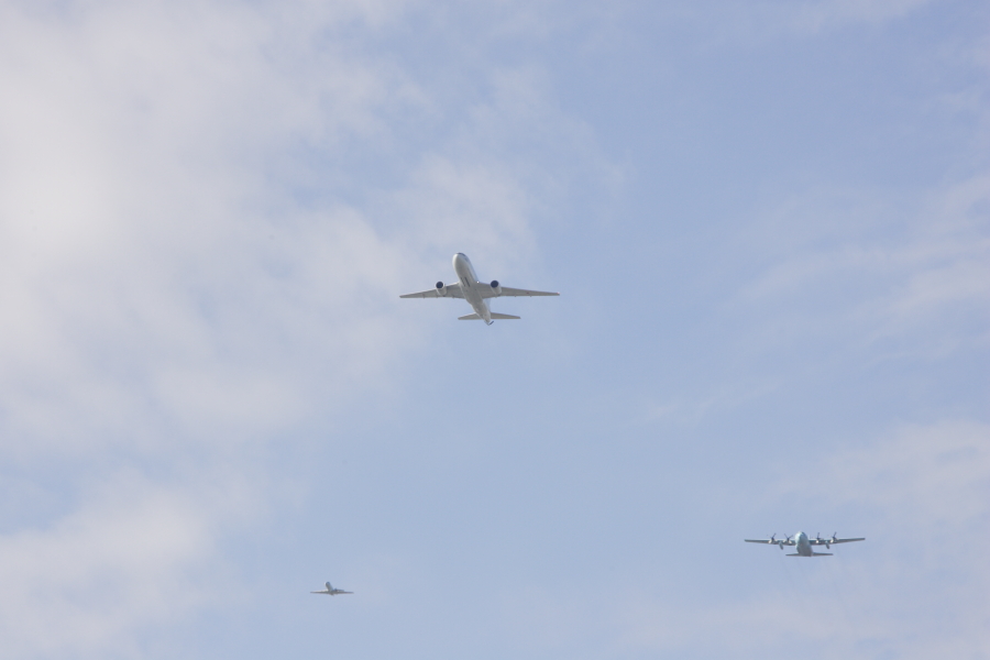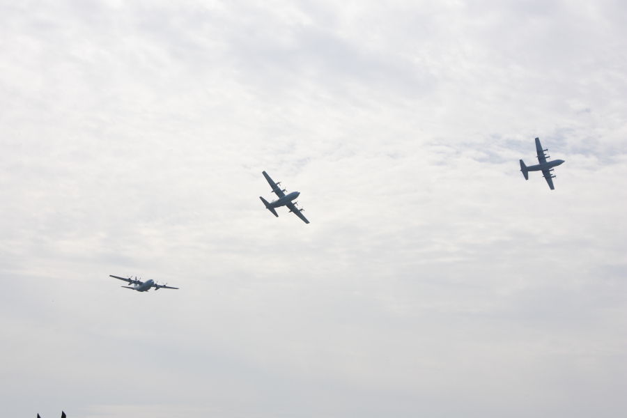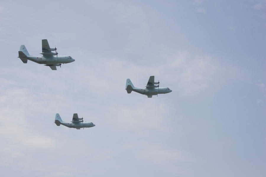 | オープニングフライト。先頭KC767、向かって右C-130H、左U-125Aの異機種編隊。 |