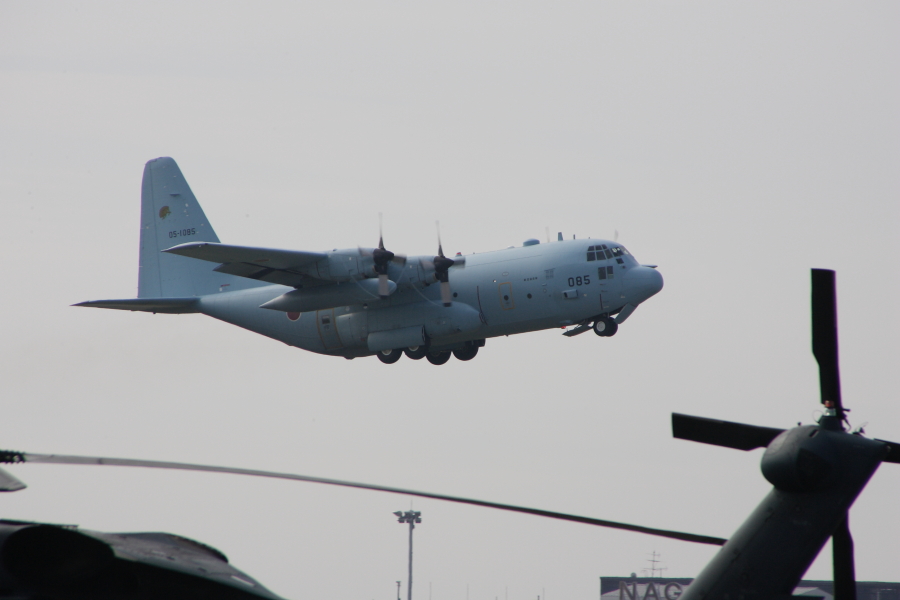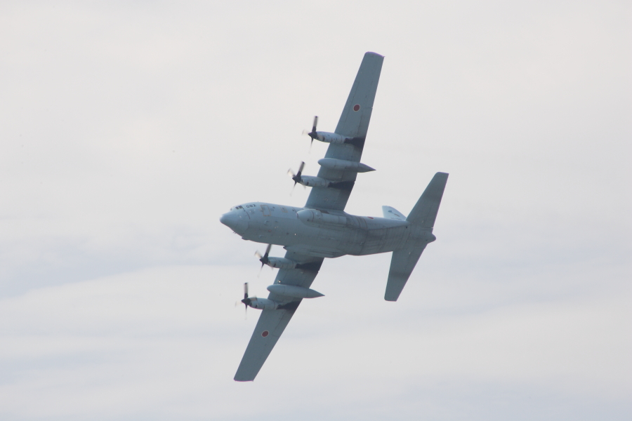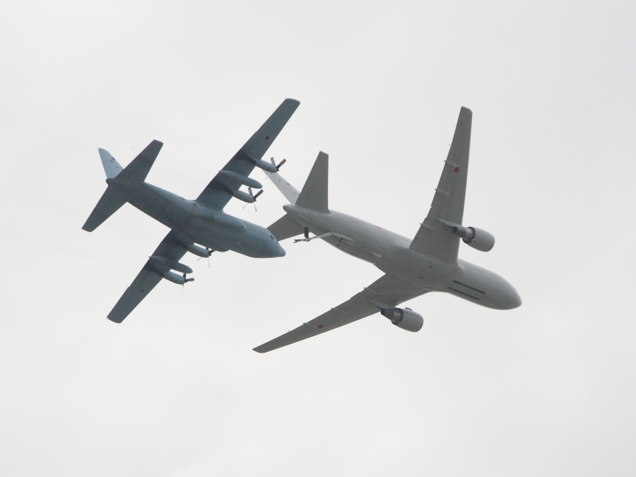 C-130Hに対して空中給油の模擬しながら、360度の編隊旋回を実施しました。飛行特性の違う2機を近接させての旋回するのは難しい。 |