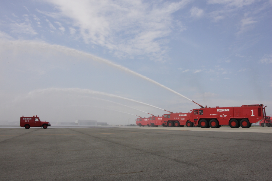 空中で編隊を組んでいる間、会場では消防隊の放水デモ。 |
