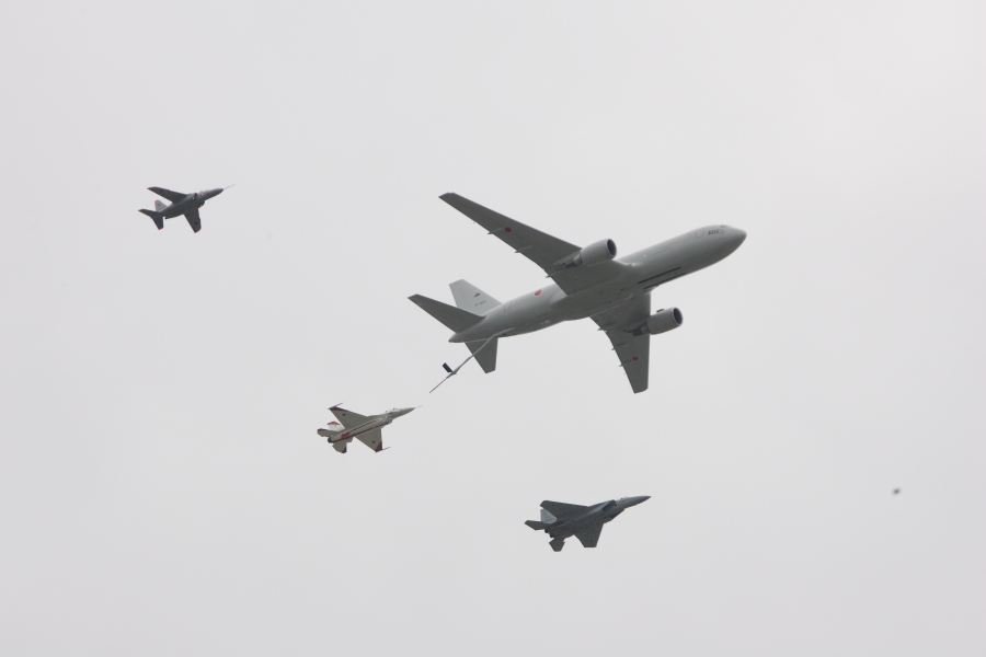 岐阜基地から飛来のF-15、F02、T-4と編隊飛行するKC-767。F-2に対して空中給油を模擬している。空中給油用のブームが伸びています。 |