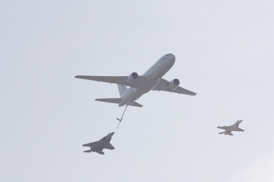| 小牧から飛来したKC767と実験航空団のF-15で空中給油の展示。右側はF-2 |