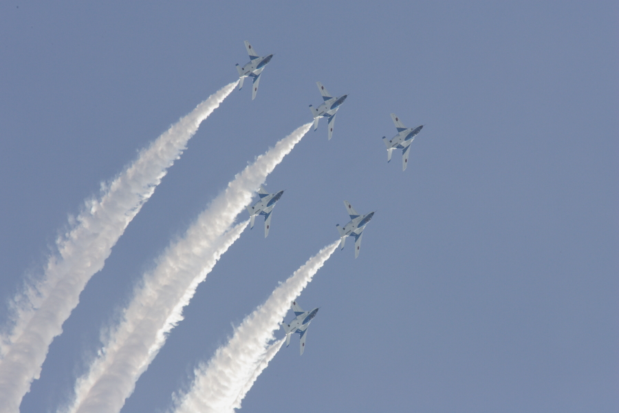 6機のデルタ隊形でループを実施するブルーインパルス。もう少しで、ループの頂点です。ブルーインパルスは11時に展示しました。そのときの人出が最高でした。 |