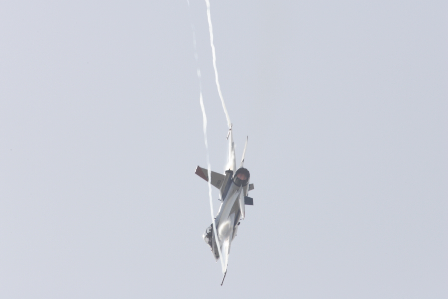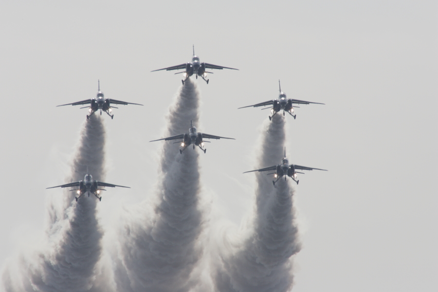 異機種大編隊の航過の合間に、急旋回を実施するF-2.バンク角90度で、ベイパーが発生。 |