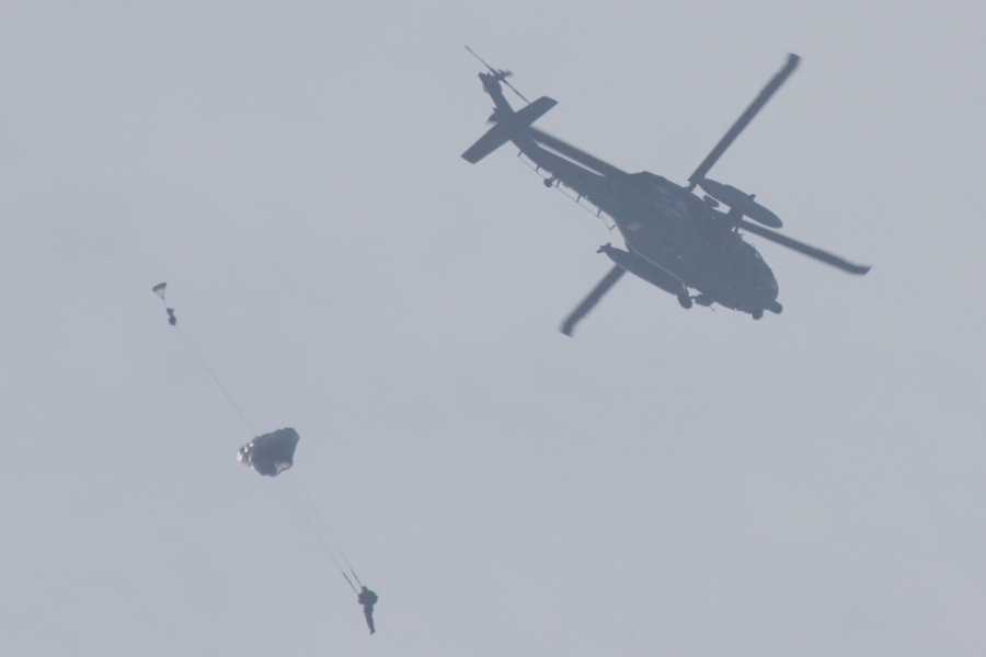 午後最初の展示は救難団の教導隊(小牧)による救難展示。救難員はヘリからパラシュート降下しました。 |