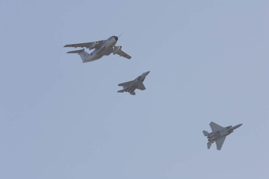 C-1とF-15の編隊で進入し、コンバットピッチで解散し着陸。大型機と戦闘機の組み合わせで行うの大変珍しい。 |