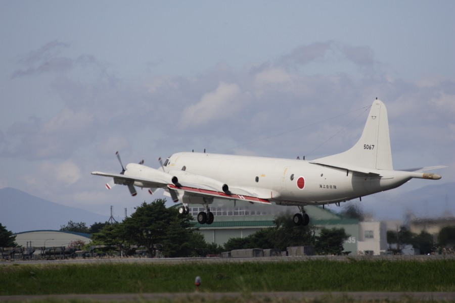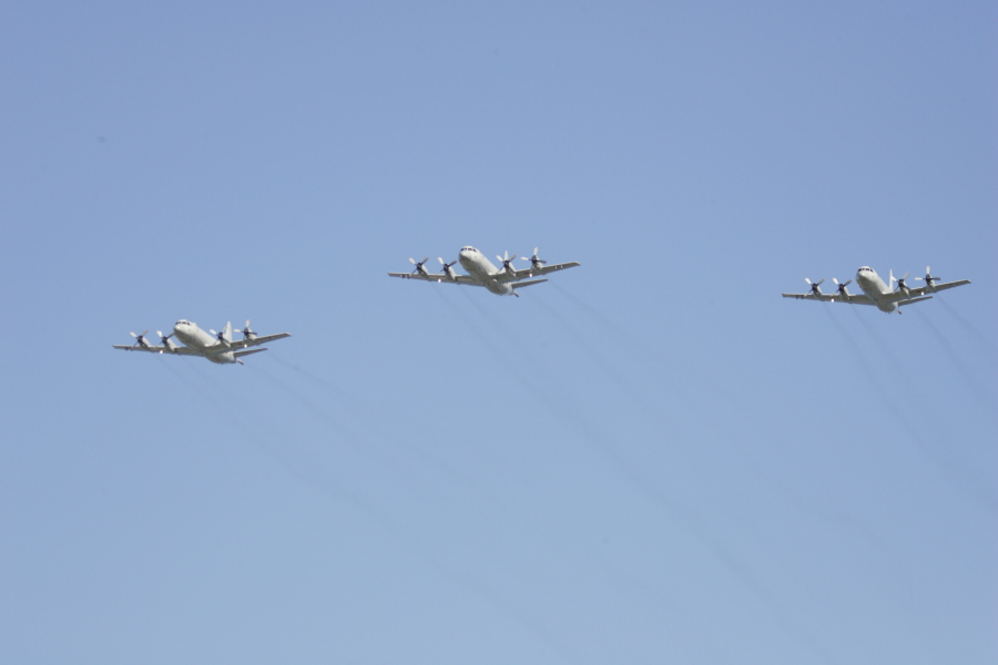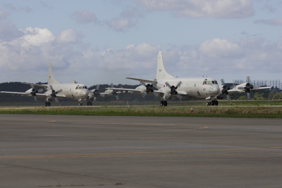 | 滑走路へ向かう2機のP-3。同じP-3Cですが機体上部に衛星通信アンテナのドームがアリ、ナシという違いがあります。導入以来、いろいろな改造が入っています。 |