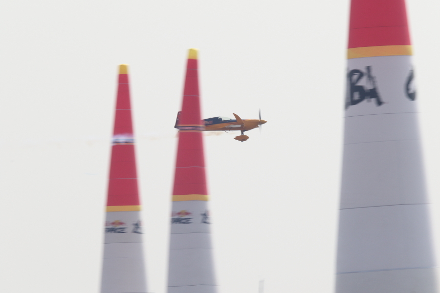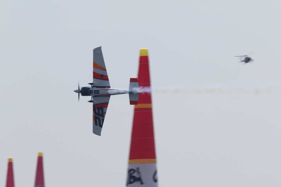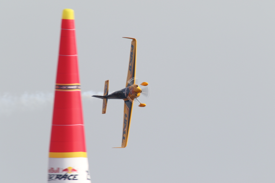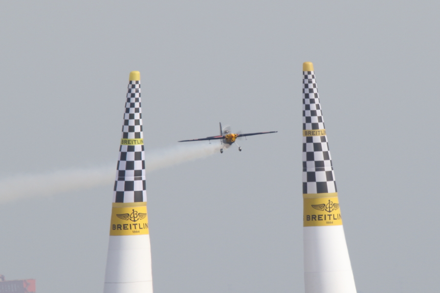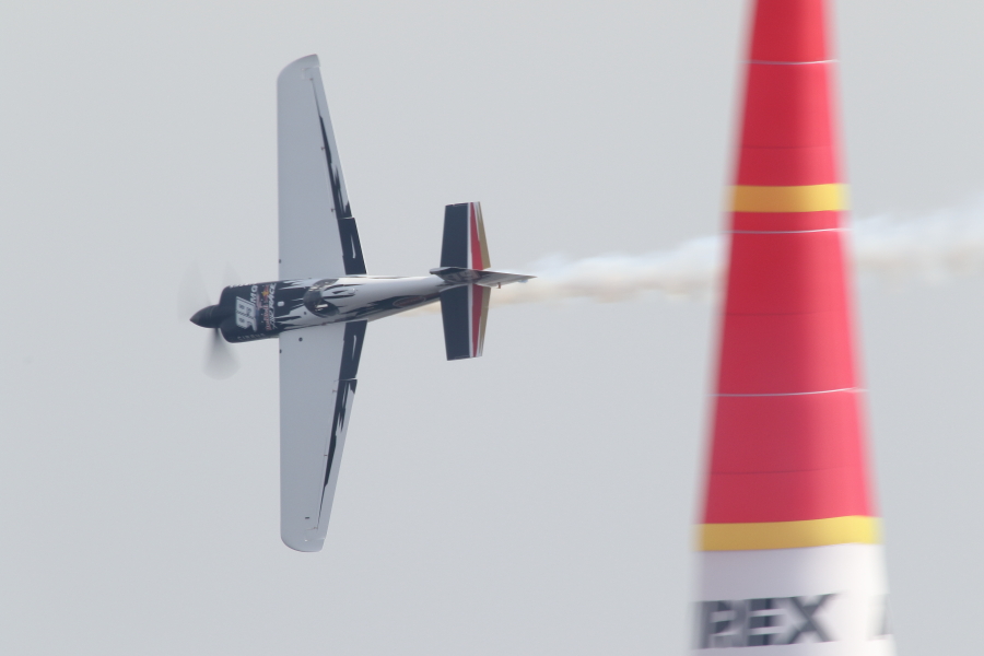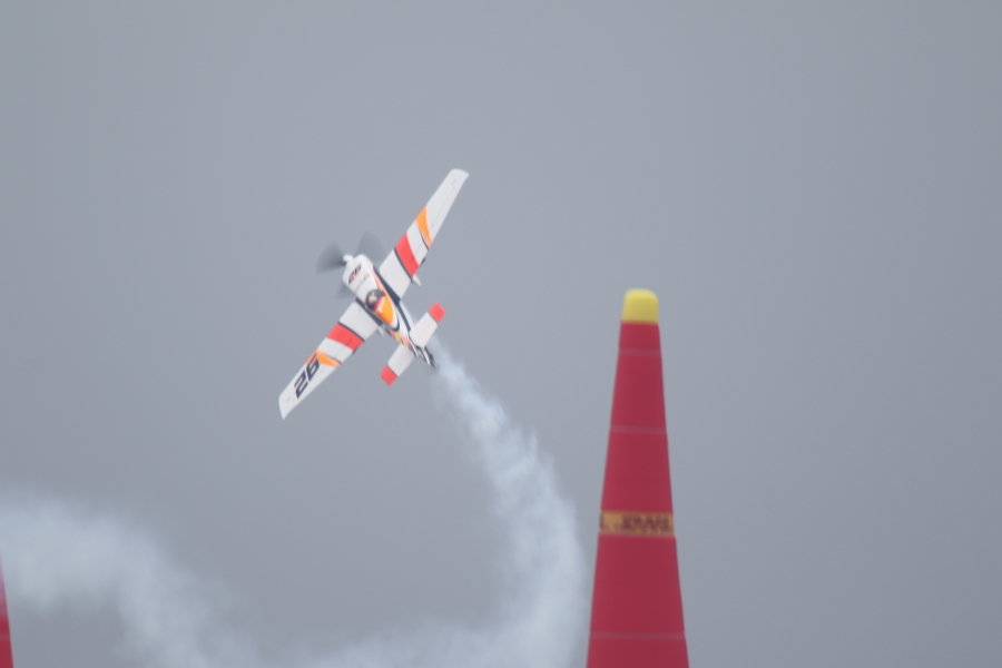 レッドブルエアレースは、エナージドリンクメーカが開催するエアレースで、設置されたパイロンの間を蛇行し、そのタイムを競います。自動車のF-1のように世界各地で開催され、通年で順位が競われます。今年2015年は日本発となるエアレースが行われました。場所は千葉県の海浜幕張です。コースは海上です。16日は練習と予選、17日は決勝です。チャレンジクラスとマスタークラスに分かれており、マスタークラスの14名の中には日本人パイロットの室屋さんがおられます。室屋さんはコースレコードとなる50.779秒を出しますが、続くRound Of 8では、オーバーG(10G以上)になりDNF(Did Not Finish:失格扱い)となし惜しくも敗退となりました。優勝はポール・ボノム(イギリス出身)でした。