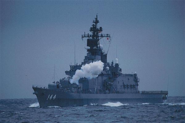 訓練展示の最初は空砲発射です。「くらま」「さわかぜ」「はたかぜ」「しまかぜ」の4隻がすれ違いながら、各艦空砲を4発発射。砲口から黄色い炎の塊が一瞬飛び出し、白煙が吹き出て、少し遅れて「ど〜ん」という大きな音が聞こえます。