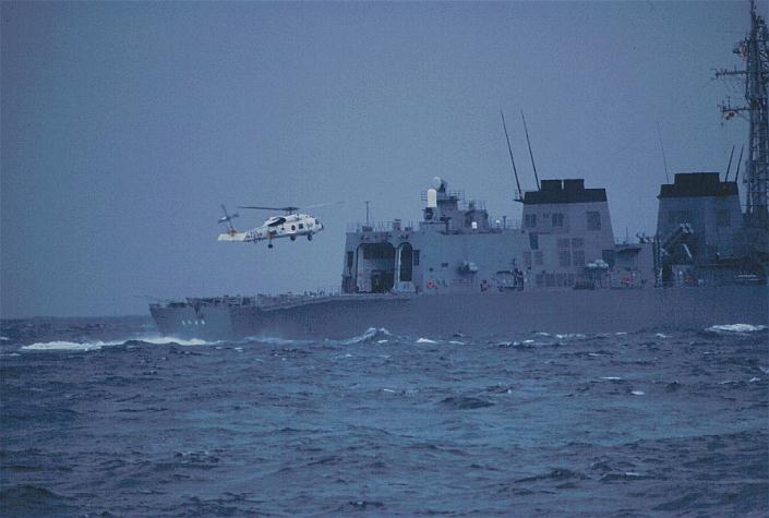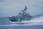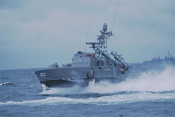 ヘリが飛立った後、前方より3隻のミサイル艇(PG821,PG822,PG823)が接近してくる。ミサイル艇に名前はなく、単に1号、2号、3号である。これらのミサイル艇は水中翼船タイプであり、46ノット(約85km/h)の高速で近づいてくる。各艇は一斉に360度ターンを実施し、軽快な運動性を披露する。旋回中は旋回の内側に船体を傾けるのが、印象的である。2回の360度旋回を行いつつすれ違っていく。