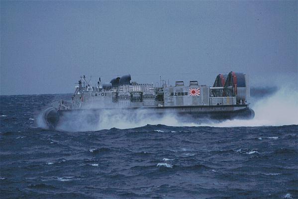 その次は2隻(?)のエアクッション艇(通称LCAC)が、水煙を上げながらやってくる。エアクッション艇、「おおすみ」に搭載されており、水面からそのまま陸上に上がり、車両等を揚陸するものである。