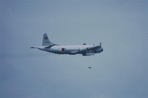 US-1の後はP-3Cの対潜爆弾の投下である。2機のP-3Cが前後に並んだ隊形で、後方より接近し、各機4発の対潜爆弾の連続投下を実施する。開かれた爆弾庫から時間差を置いて、投下され、着水、そして、水中衝撃波に打たれた艦が震え、巨大な水柱が立つ。