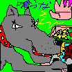 女 | 犬科くらい | 首輪付き狼くん | ズバリこの絵は、小さい頃首輪付き狼くんがせっかく、肉団子を最後にとっとこうと思って、おにぎりから食べ始めようとしたら、「ちょっと待ったコール」がかかってしまった!という図。 |
