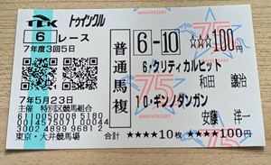 1/31(土) JRAで衝撃の史上最高配当!小倉6Rで3連単5836万7060円 18番人気→17番人気→10番人気で決着 的中わずか1票 ファン驚愕「100円が5000万に」「これは買えん」「えぐすぎる」 おおー、これはスゴイ! いつだったか家で川崎競馬の中継を見てた時に三連単で1400万が出たことがあったんだよね。 ちなみに三連単とは1着2着3着の馬を着順込みで当てる馬券で、一番当てるのが難しい代わりに配当額がデカい。 それでも数万とか15万とかはちょいちょい見るが1400万なんて初めて見たので驚いたんだよね。 なので 「スゴイな!100円が1400万になるなんて金銭感覚変わっちゃいそうだな」 「ねー」 「堀之内のお店を1件まるまる貸し切れるじゃん」 「堀之内って何?」 「川崎競馬場近くの風俗街」 「…」 なんて会話を嫁さんとしたりしたw で、この話を去年YADセンセと飲んだ時にもして 「でも、その馬券買ってた人が居たかどうかは分からんがね」 と言ったら 「いや、多分居る。 三連単マニアってのが一定数居て、そう言う人らは全ての組み合わせの三連単を買う」 と聞いて驚いたんだよw 実際に川崎競馬場に行くと、内馬場の大型ディスプレイにはレースの合間は次のレースのオッズが表示されてて、 三連単のオッズもズラッと表示されてるんだけど、下の方にシレッと「未発売組み合わせ:0」と 全てのレースで表示されてんだよね。 つまり、三連単はすべての組わせの馬券が全レースで出てるってことで 「三連単マニアってホントにいるんだ…」ってなったw 今回もこの馬券買ってた1人はそう言う三連単マニアだったんだろうねw ちなみに後で電卓で計算したんだけど、 16頭立てのレースで全ての組み合わせの三連単を100円づつ買うとなると、 16x15x14の3360通り買わなきゃいけないので33.6万必要。 1レースにだよ? しかも30万なんて配当はめったに出ないので、これはかなりリスキー。 ただ、例えば12頭立てのレースなら12x11x10で13.2万、9頭立てだと9x8x7で5.04万と 必要額はかなり減るので、これで15万の配当が来れば勝てる。 とは言うもののなぁ、そうそう毎レースごとに15万来るとも限らないしなぁと嫁さんと笑ったんだよね。 ちなみに、こちらは昨日の大井のレースの配当金一覧。 この日の三連単は第1レースで20.1万、第6レースで28.6万、第10レースで22.8万と かなり高額配当が出たと言っていいが、全12レースの三連単の配当金を合計すると90.5万。 仮に全レースで全組み合わせの三連単を網羅して買ったとしたら必要なのは163.86万となり、 かなり高額配当が出た日ですら73万の負けとなって、損失としてはかなり辛い。 しかも中央ならともかく地方競馬は平日毎日やってますからね。 平日毎日70万づつ負けてたら、普通は心と財布が折れるでしょw まぁでも、たまに三連単で150万とか出るときもあって、その時はプラ転するとしても、 今までの損失を埋めてまだプラスになるかどうかは微妙だなぁw なので、上の記事の人も今回は5800万貰ってますが、多分今まで三連単に注ぎ込んできたカネのこと考えると、 多分マイナスか、良くてもプラス額はちょびっとだと思うw なのでまぁ、馬券は勝つ気で買うんじゃなく、 馬や騎手の名前の入ったカードを100円で買う位の気持ちで買うのがいいんじゃないなかなぁw 少なくともウチらはそう言う買い方してます。 例えばこう言うのとかねw ![]() これなんかは完全に馬の名前だけで買ってるが、馬複にしてるところが未練がましいよなwww あとは、嫁さんが可愛い名前の馬にお気に入りの騎手が乗った時の馬券が当たったのに 「160円貰う位だったら、この馬券を記念で手元に置いとく!」 とか言ってたくらいだしねw こんな馬券買いながら競馬場グルメを楽しんで、馬の写真撮ってるくらいが健全な競馬の楽しみ方だと思ってますw ああそうそう。 競馬での儲けは一時所得となって所得税が掛かるので、上の記事の人は来年の所得税は大変だろうなぁと思いますw ムサコはもっと東京向きかと思ってた。 て言うか、横浜文化圏で暮らすんであればムサコはコスト高すぎない? 横浜に近くてもっと安く住めるところいっぱいあるでしょ… 米国の国際法違反になぜ沈黙? ベネズエラ侵攻までに蓄積された例外 >法の支配とは、そこにあるものではなく、その確立のために不断の努力が求められるものです。 今の世界に最も必要なものは法の支配だと思います。 DCS 2026 AND BEYOND とうとう来たね! そして、歩兵がめっちゃ動いてる! これは地上ユニットアセットパックのCombined Armsをこう言うふうにアプデするよ!ってことなんだろうなぁ。 現状のCombined Armsの歩兵は棒立ちしてるか歩いてるか走ってるか伏せてるか位しか動きがないので、 こんなに細かく動くのはかなり楽しみ。。 ただまぁ、飛行機に乗ってる間は正直、歩兵の動きとか全然関係ないんだけどねw けどまぁ、アパッチとか乗って赤外線で見てたら歩兵の動きとかは重要になってくるんだろうねぇ。 あと、WW2パートでは最上型が滅多撃ちされてて可哀想w こ
